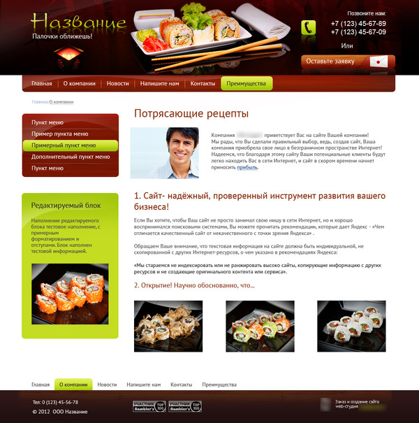Сайт создаётся на русском языке, дизайн сайта изменяться по желанию заказчика (заменяются изображения и редактируются стили элементов).