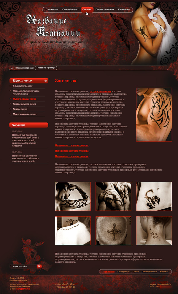 Шаблон (№18962) для сайта тематики "Тату-салоны и татуировки". Номер шаблона 18962. Обратитесь за подробностями к нашим специалистам.