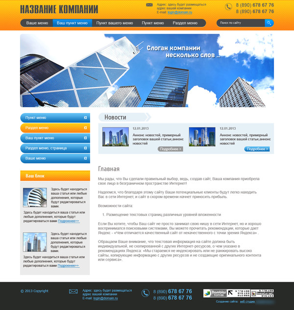 Сайт создаётся на русском языке, дизайн сайта изменяться по желанию заказчика (заменяются изображения и редактируются стили элементов).